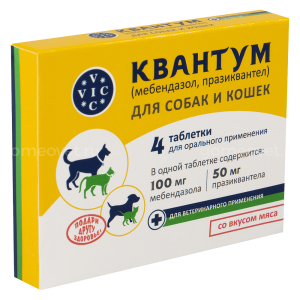 Квантум (4 таб) - антигельминтный (противоглистный, антипаразитарный) препарат для собак и кошек. Применяется с профилактической и лечебной целью при нематодозах, цестодозах и смешанных гельминтозах.